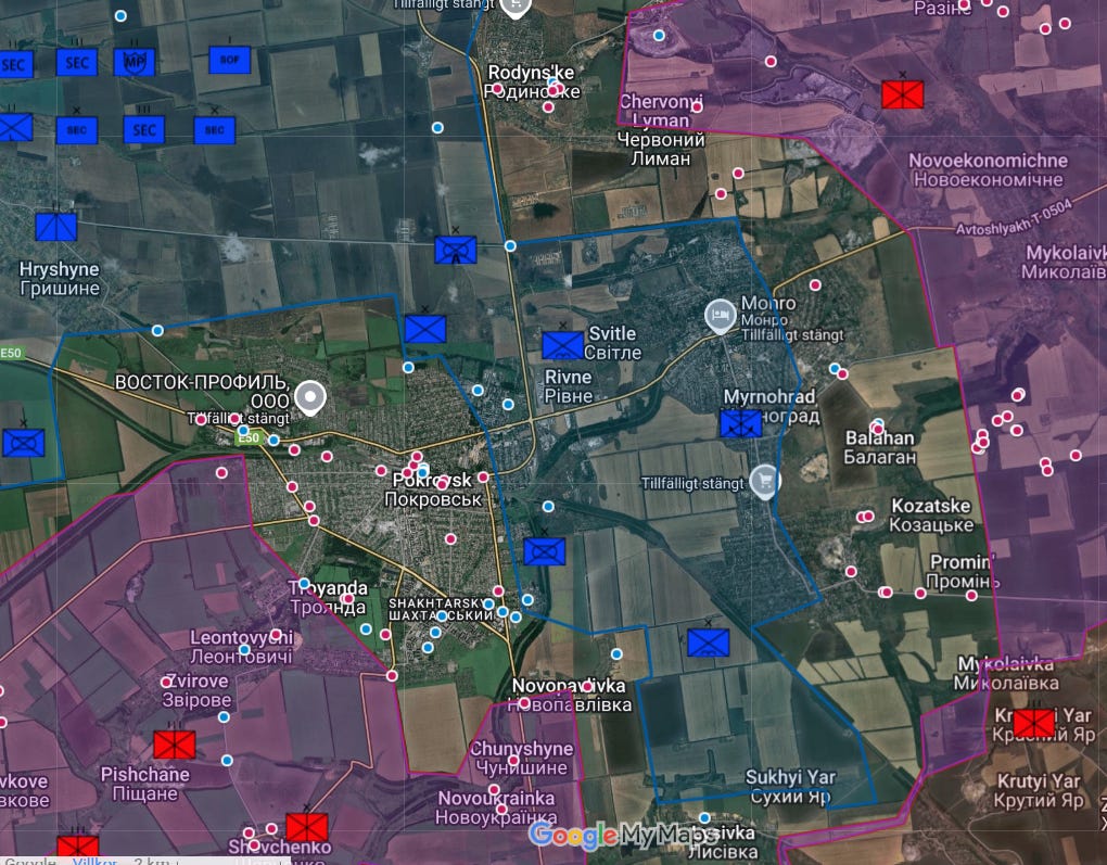 Slutligen vill jag betona att det är näst intill omöjligt att rita en verklig krigskarta över Pokrovsk/Myrnohrad eftersom ingen kontrollerar enhetliga områden.