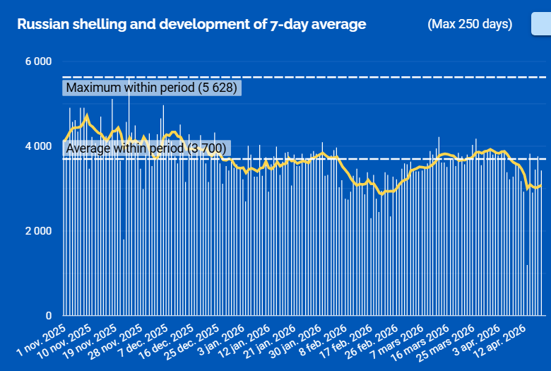 Långa medeltalet på ryska anfall (30 dagar) kvar på lägsta inom perioden 1 maj förra året och idag. Även sjudagars ser ut att bottna inom kort.