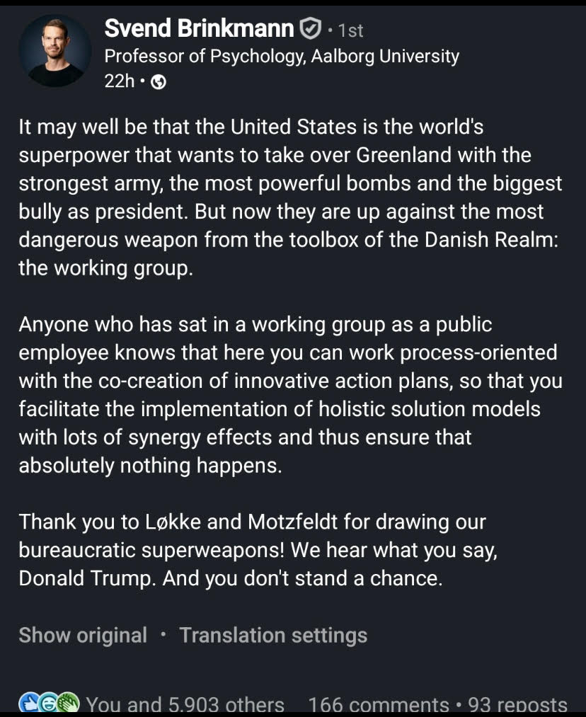 Det Trump gör är att helt kalkylrerat provocera Europa, och Grönland var en röd linje för oss tydligen trots alla kommentarer om motsatsen som jag fick vintern och våren 2024.