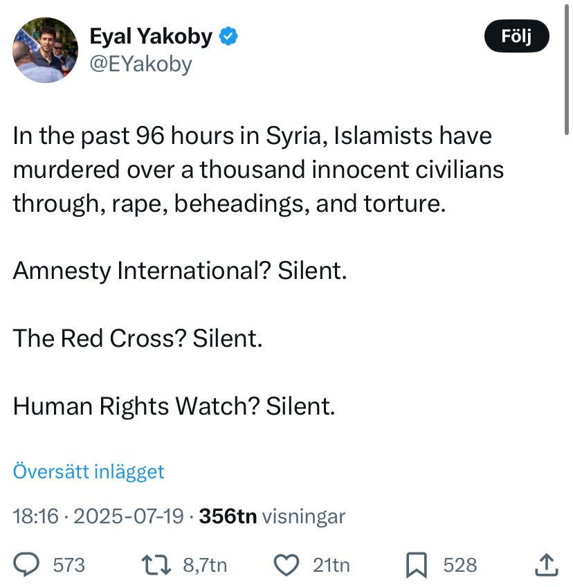 Men jo – det händer saker där också absolut men seriösa läsare förstår den poäng jag vill göra och det är inte att förminska Gaza utan visa på att den etniska rensningen av Druserna borde dra ned samma vilja att stoppa med demonstrationer som Gaza gör.