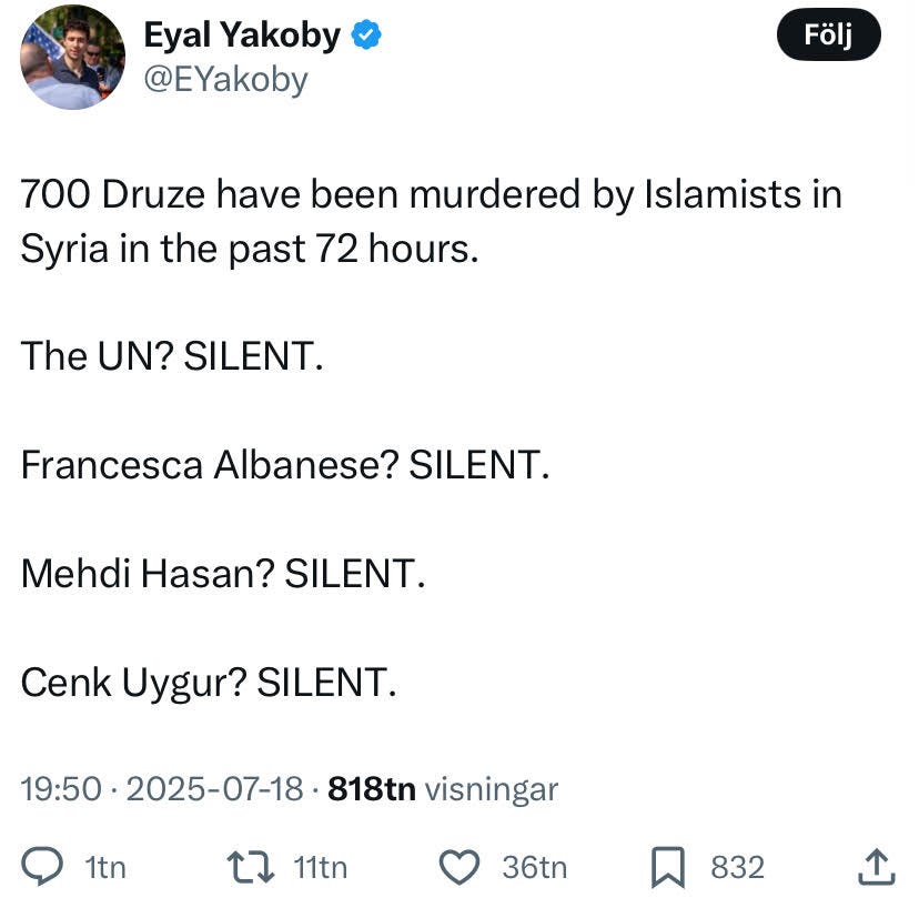 Numero dois – hela den här PR maskinen som gick igång 2015 och som gått igång sedan 7 Oktober där parlamentariker, politiska partier, offentliga debattörer, demonstranter och ”breda folklager” demonstrerar emot folkmordet lyser helt med sin frånvaro i fallet druserna eller hur?